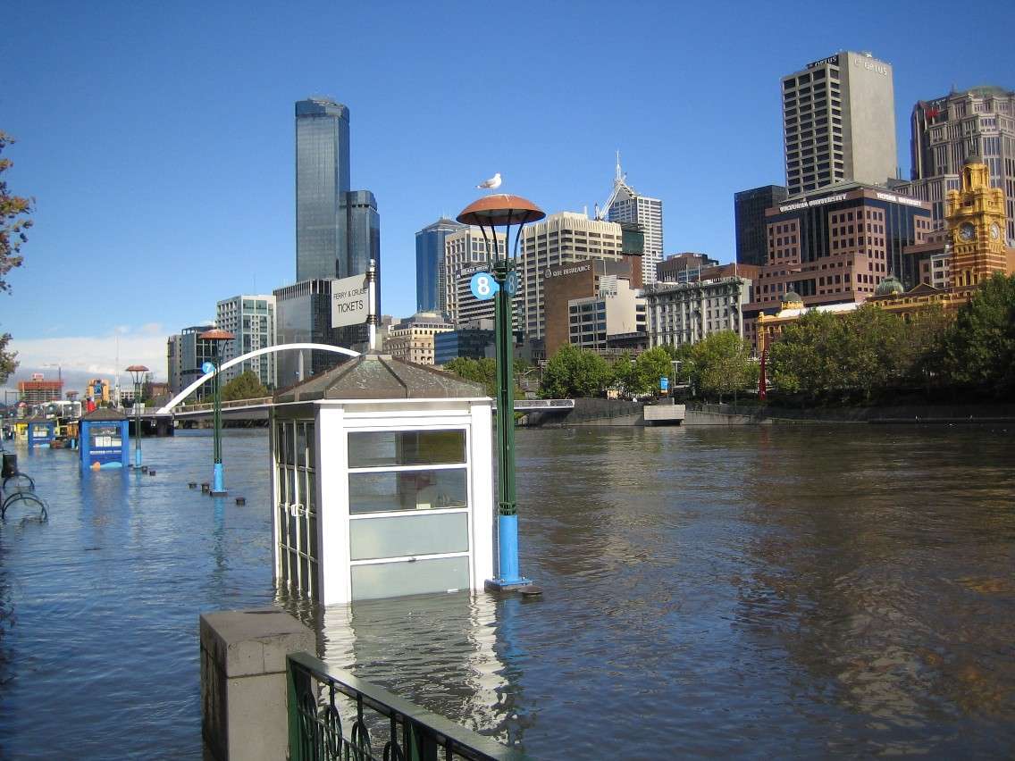 The middle of Melbourne is flooded as you can see in the photo of the Yarra taken earlier today, a kid's gone missing, tens of thousands of homes have been without power, national and international airports have been blocked off, heavy snow has been falling in the alpine regions (despite temperatures of 36C just a few days earlier), a guy was injured in Ballarat when a tree fell on his car, a 10-year-old girl was pinned to her bed by a tree which crashed through the roof, winds of 120kms/h have been blowing in Tasmania, a 16-year-old Sydney schoolgirl was killed by a falling tree while on a school camp, a school building's roof was blows clean off, and dust storms in Queensland have cut visibility down to 100m in some areas.