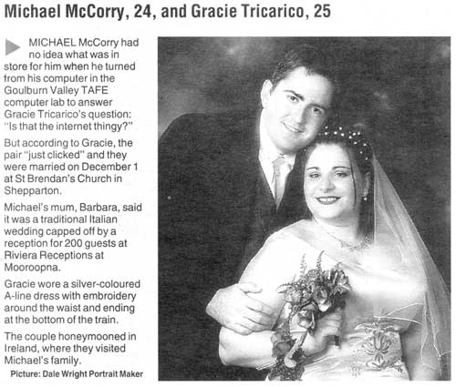 Remember when I mentioned that our wedding photo might appear in the Herald Sun? Well it happened on Sunday. YAAY! Click here to see the article. In other news, I'm de-jetlagged and back at work. Unfortunately it seems as though I've lost about 44 photos from the honeymoon due to a corrupt memory card. Gah. At the moment, my efforts are concentrated on fighting Crownstar International to get my money back. More news to come. |