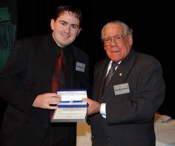 Me, accepting my award from Mr. Don McPherson | Oh yeah, and Saturday was the 2001 McPherson Media Group Annual Awards Night, and from ALL of the THOUSANDS of other web developers in the company I picked up the award for "Website of the Year 2001" for my work on the Taco Bill website. I also won the award last year for my work on the Flash intro to the Australian Airbrush Art website. I got a framed certificate and a nice boxed pen with "Website of the Year 2001 - Michael McCorry Taco Bill" written on it. Still with me? Good... Hmmm... what else has been occupying my time... Hmmm... Well games-wise, I've been playing Monkey Island 4 on the PC and Grandia 2 on the DC. I've also been toying with M.U.G.E.N. which, for those who don't know, is a kick-ass, free vs-fighting game engine which allows you to download from a selection of hundreds of characters and background stages to form your own super fighter megamix. Mine's looking at having about 156 characters now, with about twice as many backgrounds. I'm currently filling in the gaps with missing characters, while searching for the right music to accompany the many, many stages. I tell ya, it's gonna be kick ass. Mail me for more info if you want it. It think I'll wrap this up now. My intention is to inform, not bore, so I'll leave you with a little news that my domain name comes up for renewal in January 2002, so I'll be planning a complete revamp of the website in time with that. Also, I've found a good use for my AYBABTU.org domain. What, exactly? You'll have to wait and see. |